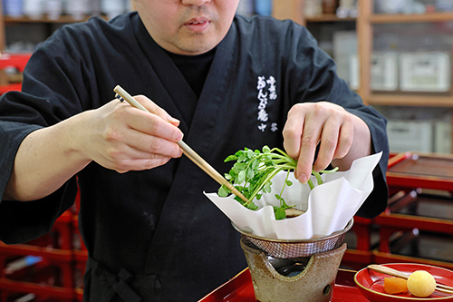 松村 現代における「新しい伝統料理」ということです。足掛け4年で、料理会の回数を重ねて、本当に色んなお料理をつくっていただきました。今では定番となったクレソン鍋と生麩の照り焼きは、初回の料理会でつくっていただいたものです。