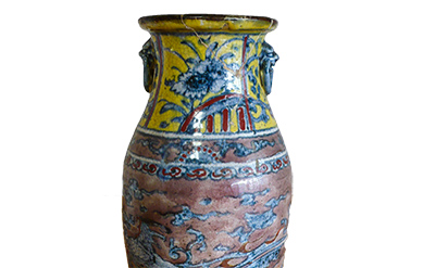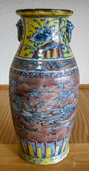 なお、蓮弁を底部に設けることは、仏様や菩薩様が蓮弁に坐したり立ったりすることから、この花立も寺院側の要請により焼かれたものと推察しますが、あまりにも派手な色絵には驚かされます。